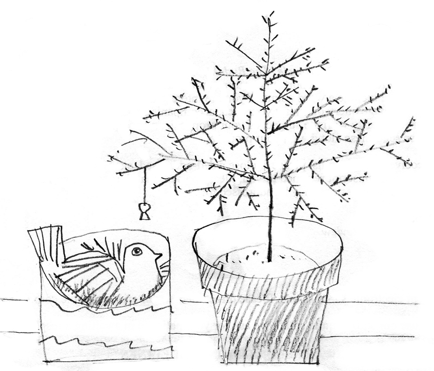 So, looks like it’s decided to build a nest there, in the Christmas tree pot container. How strange and funny! Some time later, and I’d fallen asleep, woken up and it was a different time in the day: what’s the pigeon doing now? I go to the window and take a look. It’s still there. I don’t have a camera so I’m making a sketch of it. It’s nesting in the waste paper bin that was the container that held the Christmas tree pot (with earth