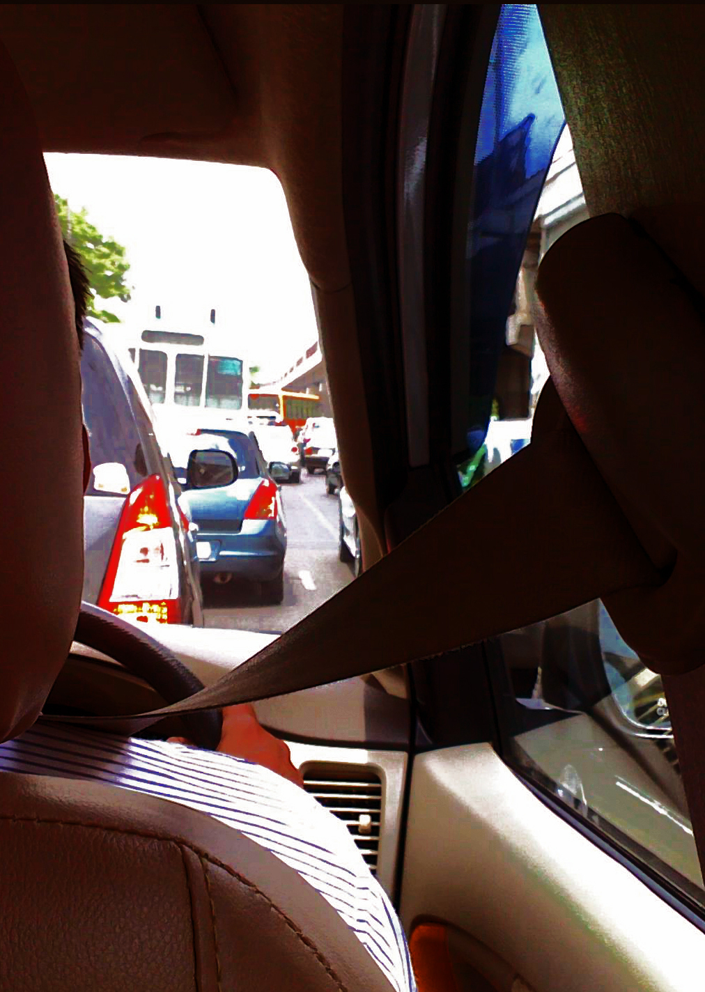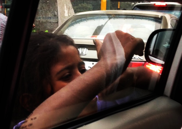 New Delhi: Sitting in the car, Shym driving, and I’m in the back seat looking out through tinted windows, incognito. Slow down and stop at the traffic lights. Street people and traders walking up and down between the vehicles, selling kiddy’s toys, books, and all kinds of stuff. Children with bunches of wilted roses knocking on windows, and discussing with passengers in auto rickshaws. One of them presses her face against my window, hands and arms cupped around her head so she can see inside through the tinted glass film. A shadowy head and face spin around looking for where I’m situated in the dark interior. Finds me, then some kind of eye contact, and: tap-tap-tap-tap on the glass with a small coin…. tap-tap. Doing it just to see what’ll happen. Shym puts the car in gear and drives forward a little bit, trying to discourage her but she remains stuck to the glass like glue, walking sideways, legs slightly back out of the way of the turning wheels.