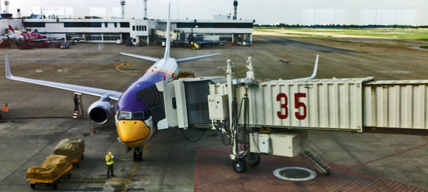 Bangkok/Chiang Mai flight: Stone cold in Departures, AC has me chilled to the bone. I walk around the shopping area, just to be doing something, and go to the magazine and newspaper shop. They have packs of Thai alphabet cards – just what I was looking for! I can find the vowel set, but not the consonant set and I ask the lady at the desk if she has it. Stress on her face as I’m asking the question; she thinks she will not be able to understand… then she realizes I’m speaking Thai – a small jump in the air, joyful surprise. Wow! Okay, so… but she’s forgotten the question. I ask again if she has the consonant cards. She starts looking but can’t find them: oh, no have, solee! (sorry) Disappointed. I get the vowel cards anyway and ask her how much it is. She says 47 baht but when she rings up my money at the cash desk, she says 74 baht – checking my change afterwards, she was right first time, 47 baht – just said it round the wrong way (47 or 74?) seeing things backwards is a problem for her sometimes. No worries, everything moves along; flight is called and we are boarded. Stewardesses in lemon yellow costume, it’s all doll-like, pretty and cute – the plane has a bird’s face painted on the nose. You can buy gifts from a trolley coming along the aisle; do I need a vinyl blow-up inflatable airplane? Nothing to get heavy about, overly serious about; no need to get stuck thinking about anything hopelessly imponderable.