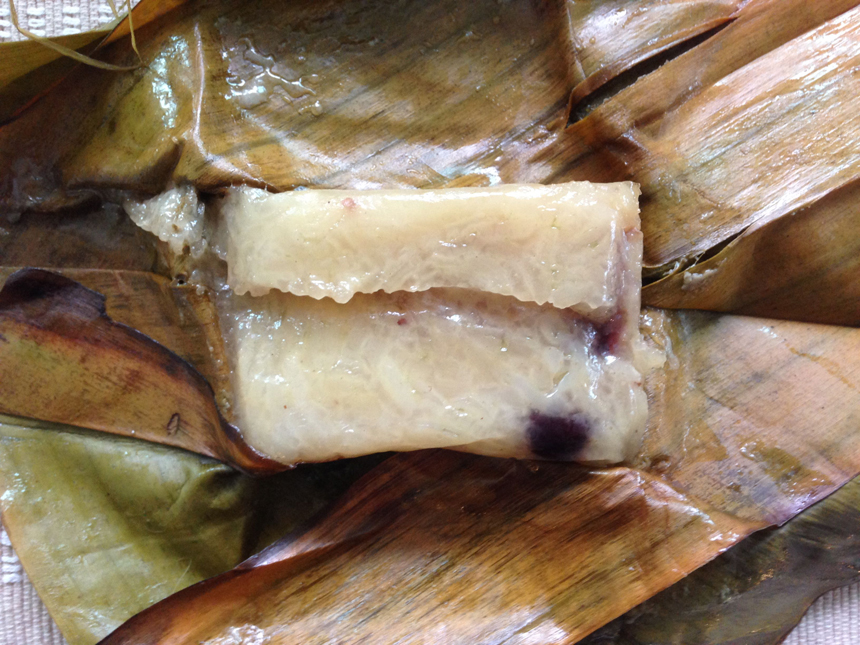 1. (below) Kao nyaow: glutinous rice cooked in banana leaves