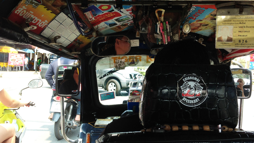 HuayKaewTuktukPOSTCARD#63: Chiang Mai: Going home in a tuk-tuk with M sitting beside me, small body-mass pressed against my side. The urgency of speed, kinda scary, canvas roof, no walls and immense sound of 2-stroke engine fills our space. Impossible to hear what she’s saying, M indicates that she wants to borrow my phone. I pull it out of my pocket, hesitate. Is it okay to play with a slippery glass-like instrument like this in a speeding tuk-tuk?  It might fly away into the great-rushing-past-outside world, anicca, necessity of mindfulness – she should hold it tight. Small face looks at me silently… don’t make a thing out of this Toong-Ting. I press it into her small hands. Hot, prehensile fingers grab, grasp and clasp the phone. Go to settings, clear away unwanted windows with the swipe of a tiny finger and launch multiplayer Minecraft.