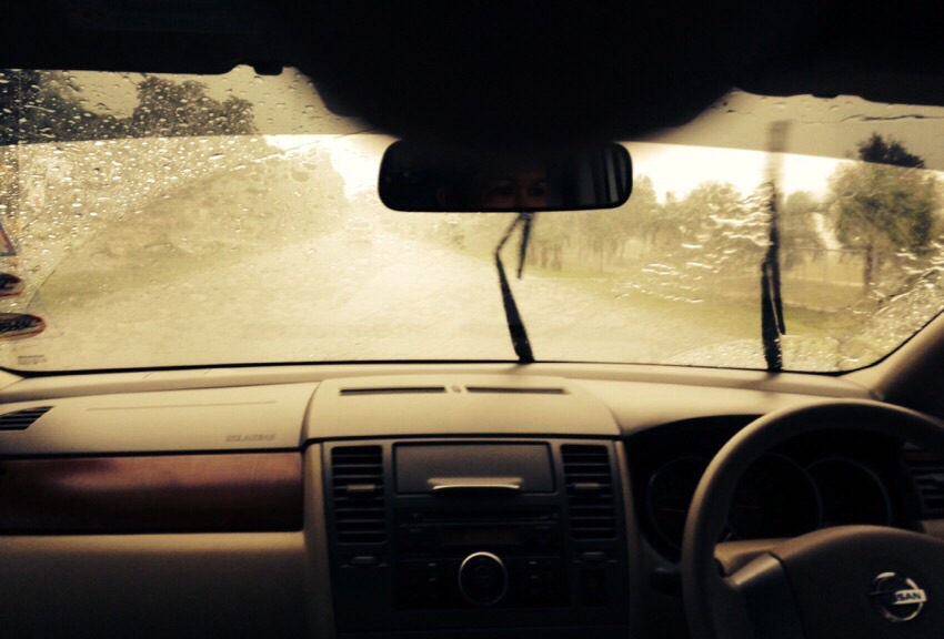 The rest of the journey is about the car making its way through flooded areas and the sloshing sound beneath where we are sitting. M looking around wide-eyed, listening – there’s another world out there through the thin fabric of the vehicle… so near. All kinds of splashing but the rain doesn’t last long, we can see it starting to ease off and when we reach the airport there’s blue sky and sunshine, as if the rain had never happened.