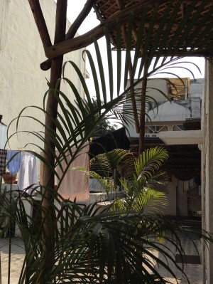 photo-8bPOSTCARD #111: New Delhi: Half asleep in the shade on the roof terrace, palm fronds swaying in the warm wind. Resting after the endeavour to get Ng on her flight to New York. She was staying with us for a couple of days because her mum was away in Calcutta on business. Ng is 15, her mum is Thai and her dad is American. Ng has a white, almost ivory skin coloured complexion; Caucasian type with oriental eyes – child of the distant future. You could say she’s unique; the feeling there’s only one Ng in the world. That quality of individuation, disentangled from the social archetype – self is a figment of the imagination; I am a unique individual not separate from an infinite number of other unique individuals in the world. The magnitude of it is beyond ordinary comprehension… takes my breath away. Ng is quietly being herself, getting on with it, planning to leave at 8pm to meet with her school dance group for a 16 hour flight to perform at Brooklyn Bridge Park, NYC. But the flight has been postponed, departure time changed to 5.00am and the group will have to meet at the school at 3.30am. Oh… should we go to sleep for a few hours, or stay awake all night? We decide to go to our rooms at 7pm and mindfully lie down for the hours remaining. It goes quickly, we’re up at 2am, bags in car and away across town.