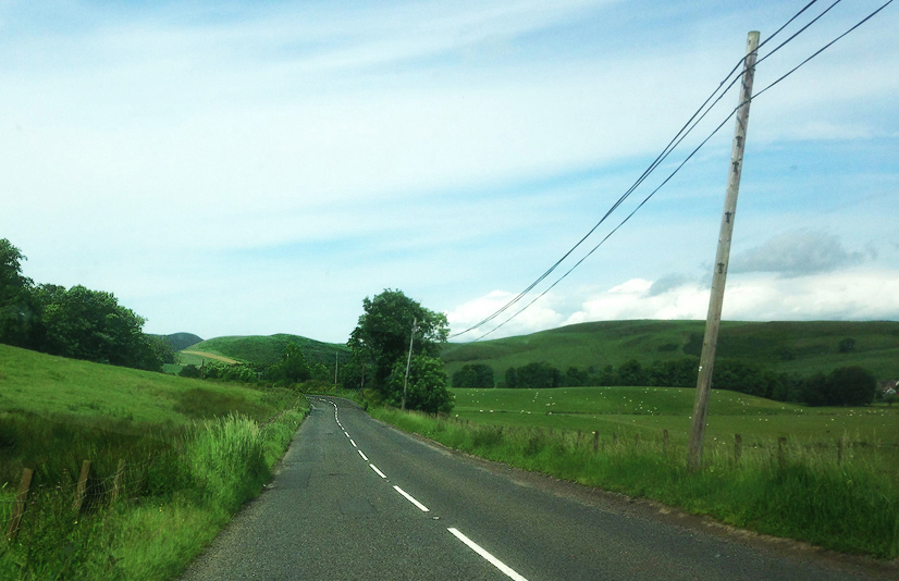 IMG_2214bPOSTCARD 137: The Edinburgh Road: For a moment I’m conscious of the present moment contained inside this moving vehicle following the white line marked in the centre of the tarmac, captivated by the directionality of the journey hurtling through a kind of wormhole in space/time, and plunging towards a vanishing point that never arrives. Pieces of a picture landscape, like a giant jigsaw, fly up and pass through the windscreen of the car, through the transparency of self and a new picture is forming. Left-hand bend approaching, steer around that, attention caught by a constant continuity of looped overhead cables on the right that continually sweep upwards and fall away like waves ebb and flow. Into a right-hand curve… tilt and rising with the camber of the road on the left side then level out and down into the next one. More curves and bends, dizzy and bewildering, winding down these slopes and (ear-popping) altitude drops on the way that leads to the coast.