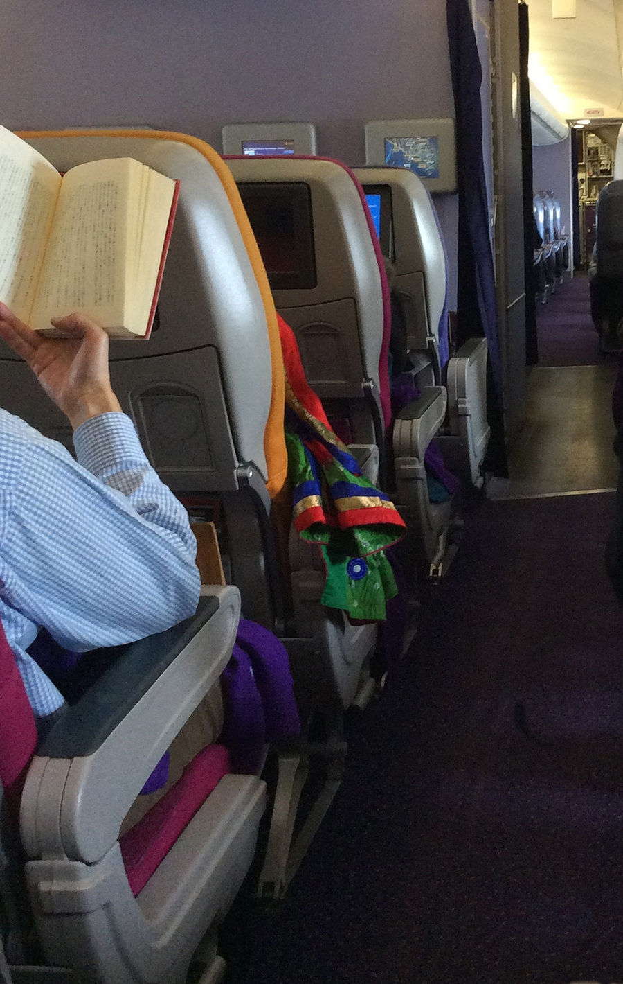POSTCARD 142: Delhi-Bangkok flight: We are reading the newspaper, sharing parts of the Bangkok Post. Jiab also has the Thai newspaper and other pages spread over the seats and folded into the magazine pocket. Comfortable environment; the aircraft furniture, cushions, colourful papers and books. It’s a pleasing, at-home feeling; this is our space – looks like a hotel room, not an aircraft. There’s the hmmmm sound of the engines and shhhhh of the air, not unpleasant. Soft pale daylight coming in through the window, and out there, the blue sky above the clouds stretching on and on, curvature of the planet… it all seems so strangely still.