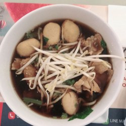Shortly after that, the waitress comes with my lunch and it’s not what I ordered, kwiteao moo sen yai naam. Eat with chopsticks in right hand and spoon in left hand. No complaints, it’ll do, notwithstanding splatters of it on my shirtfront and not recommended if you’re fiddling with a phone screen at the time. But I’m not and soon I start to get down to it.