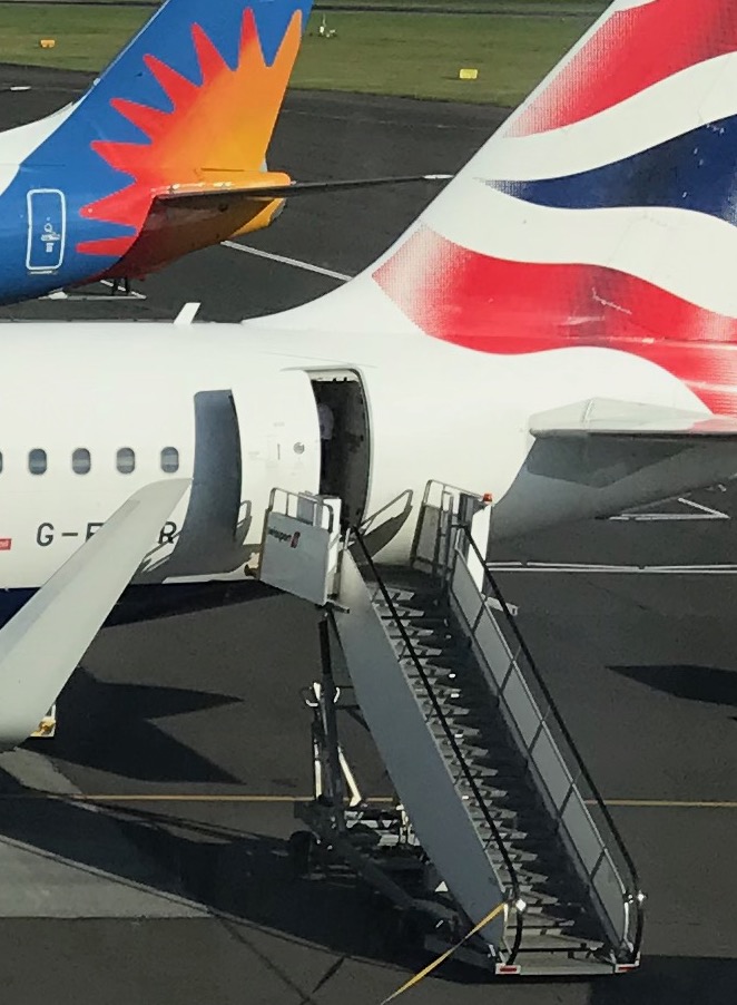 POSTCARD # 490: Newcastle Airport: I get a lift to the airport, not far, check in for the flight back to Bangkok, and it’s done… boarding pass and passport in shirt pocket, and they tell me to sit down for a while. Soon after that the wheelchair guy arrives. Jiab convinced me to go on a wheelchair, my problem is balance, if I turn too quickly, I can fall over. There have been a few falls. Hands go out, reflex reaction, in the midst of a fall, and bracing for impact. I broke the little finger of my left hand in a fall, and it never got set properly, it doesn’t go flat, it’s curved. Now I’m walking with a stick that folds away into a plastic case. Don’t need it now, I’m wheeled through the airport security portals and glitzy duty-free sections, straight ahead, the shortest possible route to Departures.