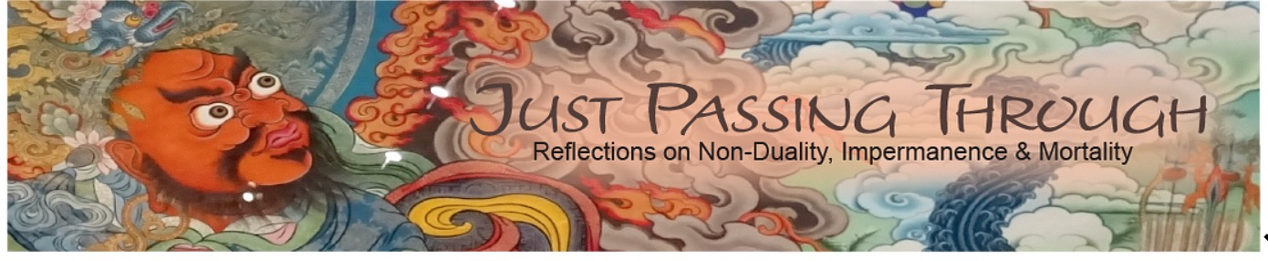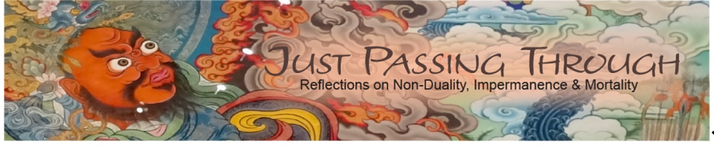 How might we extricate ourselves from the reflexive time-based mode of mentation to create space in our universe for a timeless view? The Sanskrit meaning of samsara is ‘continuous flow’—the repeating cycle of all the transitional events of human existence: birth, life, death, and rebirth. The root of the word samsara means ‘flowing into’ or ‘wandering through.’ It could also be thought of as spinning in circles. If we only thought of the transitional events (birth, death, and reincarnation) as features of samsara, we would be overlooking the continuous flow of moment-to-moment ‘events’ in between these major transitions. We are continuously wandering, always spinning into ourselves. Can we imagine anyone ‘flowing out of themselves?’ Why yes, we can. I would put the saints of history into this category, people completely flowing out of karma, out of themselves, whose entire beings come to represent an absolute and common truth: Jesus, Buddha, Rumi, Padmasambhava, Longchenpa, Mother Teresa, Meister Eckhart, Sheikh Ibn Al-Arabi, Garab Dorje, Neem Karoli Baba, Nisargadatta, Ramana Maharshi, Thich Nhat Hanh and so many more. What the hell, I’ll even include Dolly Parton—strictly in a spiritual sense. These are enlightened beings. The rest of us are still flowing into ourselves.