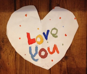 You want to look Toong Ting? Some more hesitation, then she holds up a heart shaped paper with the words: ‘Love You’, done in colours. There’s no ‘I’ pronoun, and a reversed ‘y’ – its tail going the wrong way. So much more than I’d thought, so much greater than how I feel about myself. The generosity of it takes my breath away. Later Jiab helps her to stick it on the bookshelf with scotch tape; they take a photo and send it to me in an email. First posted August 16, 2014