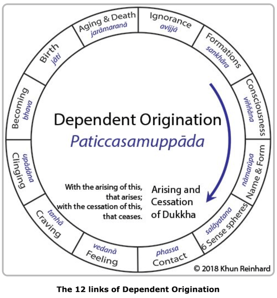 Examining the twelve links of dependent origination from a moment-to-moment perspective is probably the deepest and most important way to look at them. This spinning of the wheel of dependent origination leads to old age, sickness, death, pain, sorrow, grief, lamentation, and all the rest of the dukkha. The Buddha’s teaching is about the end of dukkha, and there are two ways to work on this. One is when there’s a sense-contact, and it produces vedanā – Stop! don’t go any further. Don’t go into the craving. There’s not much you can do before that. You’re conscious, you have a mind and body, your senses are engaged with the environment. You’re inevitably going to get contacts, and the contacts are going to produce the vedanā which are not under your control. The vedanā are happening in the old brain, the so-called reptilian structure, and that’s not under your control. It’s only after the vedanā that you have some opportunity to control what happens next.